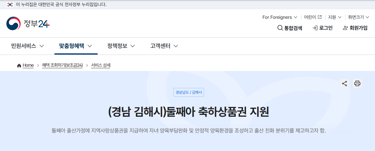 | 출생연도 | 2023년 이후 출생한 둘째아 | 김해사랑상품권 50만원 지급 |
