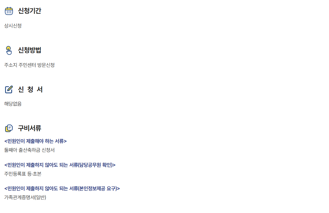 둘째, 신청서 작성 후 구비서류를 제출합니다. 기본적으로는 ‘둘째아 출산축하금 신청서’를 신청인이 직접 제출해야 하며, 추가적으로 주민등록표 등·초본 및 가족관계증명서가 제출 없이 기관 확인용으로 처리될 수 있습니다.